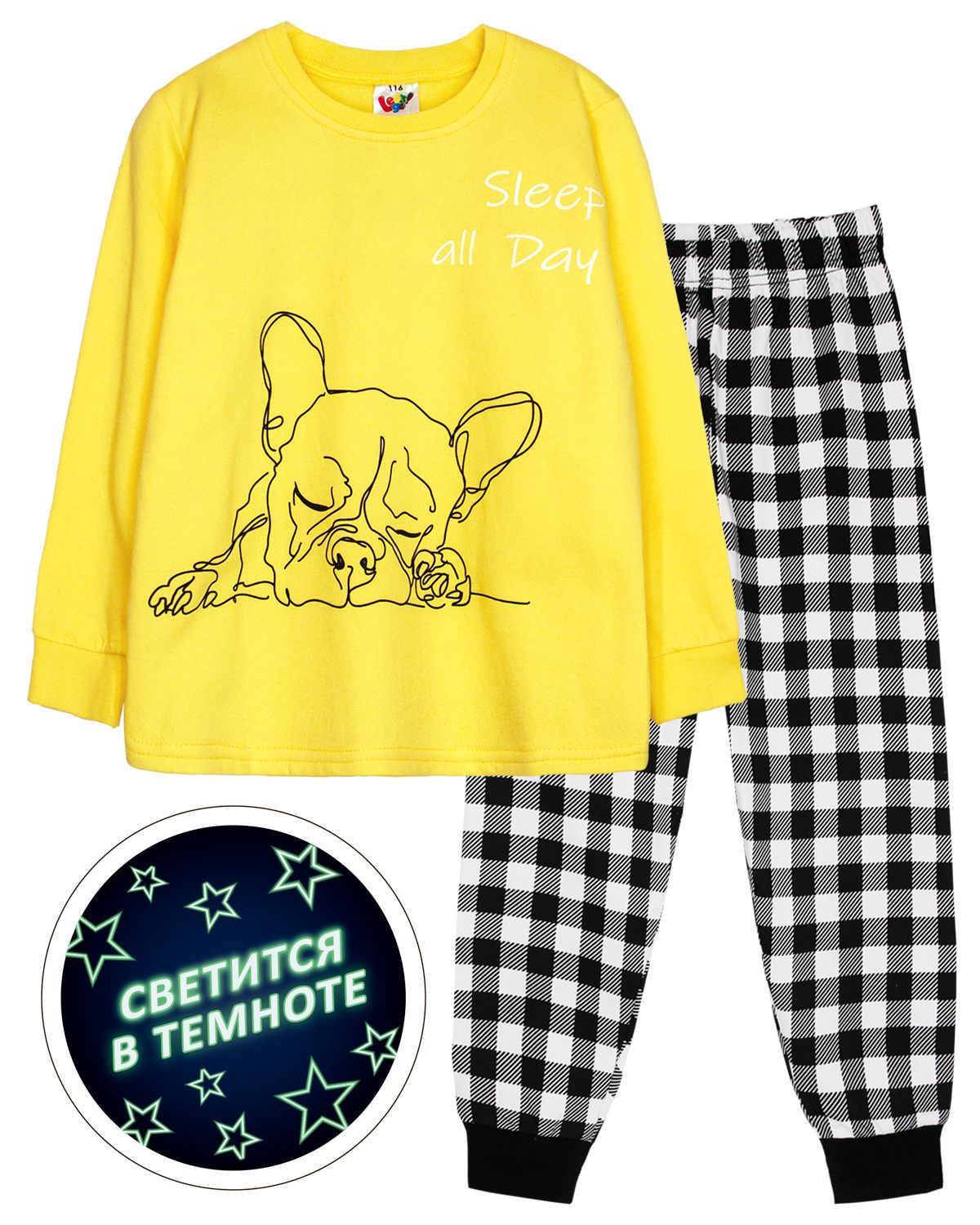 Пижама детская, состоящая из джемпера и брюк. Джемпер прямого силуэта, с втачным длинным рукавом. Горловина круглая обработана воротником из рибаны. По низу рукавов манжеты из рибаны. Низ изделия обработан швом в подгибку. На полочке принт шелкография с флуоресцентной краской. Брюки прямого покроя, из набивного полотна. Пояс цельнокроенный, с эластичной тесьмой внутри. По низу изделия манжеты из рибаны.