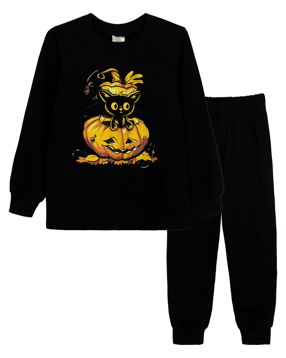 Пижама детская, состоящая из джемпера и брюк. Джемпер прямого силуэта, с в тачным длинным рукавом. Горловина круглая обработана воротником из рибаны, а также по низу рукавов манжеты из рибаны в цвет джемпера. Низ изделия обработан швом в подгибку. На полочке принт шелкография. Брюки прямого покроя, из однотонного полотна. Пояс цельнокроеный, с эластичной тесьмой внутри, тесьма закреплена в шов. По низу изделия манжеты из рибаны, в цвет брюк.