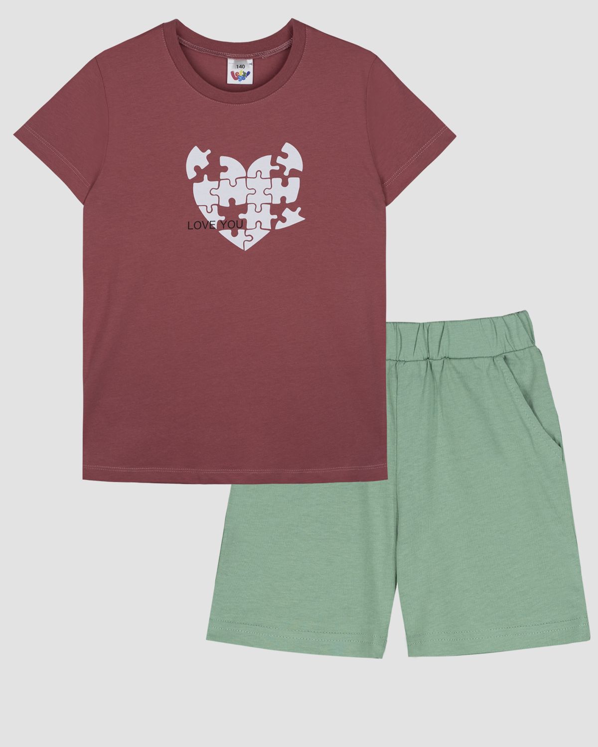 Пижама для девочки, состоящая из футболки и шорт. Футболка прямого силуэта с втачным коротким рукавом. Горловина круглая, обработана воротником из рибаны. По горловине полочки и спинки отделочная строчка. Низ изделия и рукава обработан швом вподгибку. На полочке принт ШЕЛКОГРАФИЯ. Надпись переводится как "Люблю тебя". Шорты для девочки трапециевидного силуэта из однотонного полотна. Пояс отрезной в цвет изделия, выполнен из основного полотна с эластичной тесьмой внутри. На передних половинках шорт выполнены карманы с отрезным бочком. Низ изделия обработан швом в подгибку.