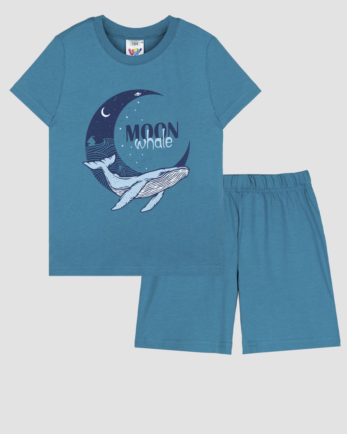 Пижама для мальчика, состоящая из футболки и шорт. Футболка прямого силуэта с втачным коротким рукавом. Горловина круглая, обработана воротником из рибаны. По горловине полочки и спинки отделочная строчка. Низ изделия и рукава обработан швом вподгибку. На полочке принт ШЕЛКОГРАФИЯ. Надпись переводится как "Лунный кит". Шорты для мальчика прямого силуэта из однотонного полотна. Пояс отрезной в цвет изделия, выполнен из основного полотна с эластичной тесьмой внутри. На передних половинках шорт выполнены карманы с отрезным бочком. Низ изделия обработан швом в подгибку.