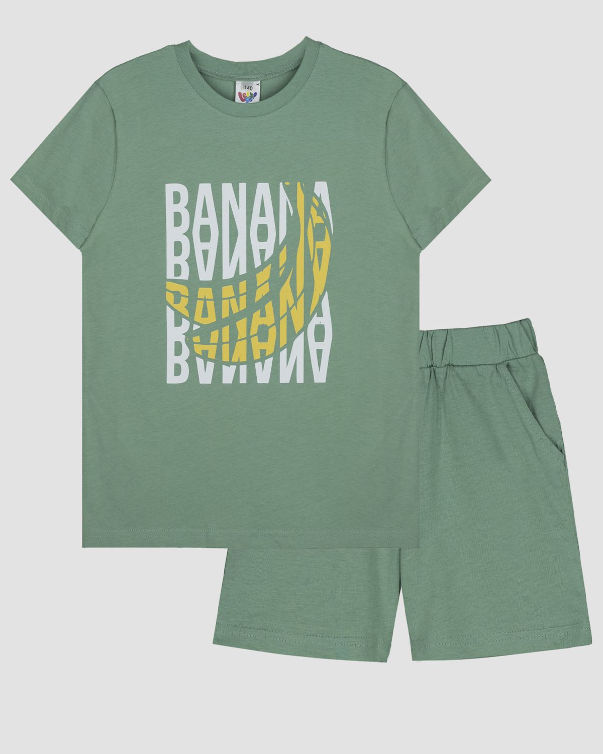 Пижама для мальчика, состоящая из футболки и шорт. Футболка прямого силуэта с втачным коротким рукавом. Горловина круглая, обработана воротником из рибаны. По горловине полочки и спинки отделочная строчка. Низ изделия и рукава обработан швом вподгибку. На полочке принт ШЕЛКОГРАФИЯ. Надпись переводится как "Банан". Шорты для мальчика прямого силуэта из однотонного полотна. Пояс отрезной в цвет изделия, выполнен из основного полотна, с эластичной тесьмой внутри. На передних половинках шорт выполнены карманы с отрезным бочком. Низ изделия обработан швом в подгибку.
