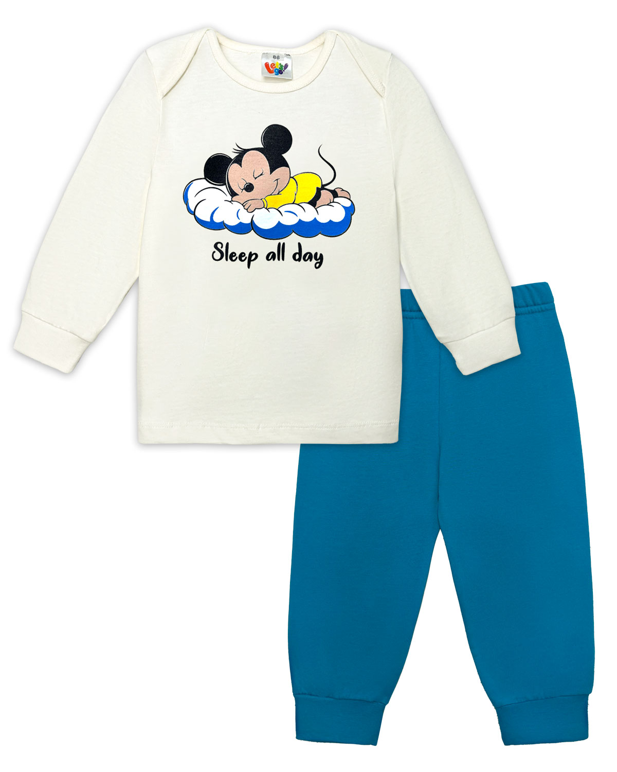 Пижама детская, состоящая из джемпера и брюк. Джемпер прямого силуэта, с втачным длинным рукавом. Горловина круглая, обработана бейкой из рибаны. Спинка, в плечевых швах, переходит на полочку с нахлестом 5см, образуя фигурное закругление к точке основания шеи, по край обработан бейкой из рибаны. По низу рукавов манжеты из рибаны. Низ изделия обработан швом вподгибку. На полочке принт Шелкография. Надпись переводится как "Спать весь день". Брюки прямого силуэта, из однотонного полотна. Пояс цельнокроенный, с эластичной тесьмой внутри. По низу изделия манжеты из рибаны.