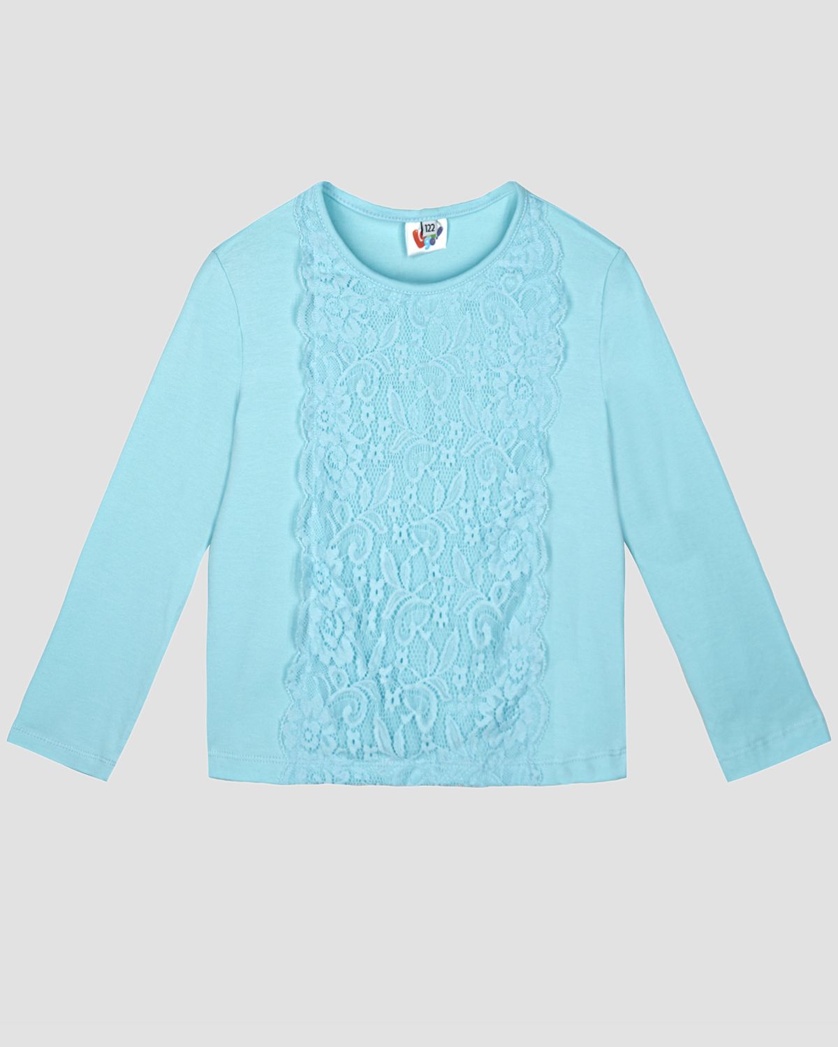 Джемпер для девочки приталенного силуэта с втачным длинным рукавом. Горловина круглая, окантована бейкой из кулирки. На полочку вертикально нашита гипюровая тесьма. Низ изделия и рукавов обработан швом в подгибку.
