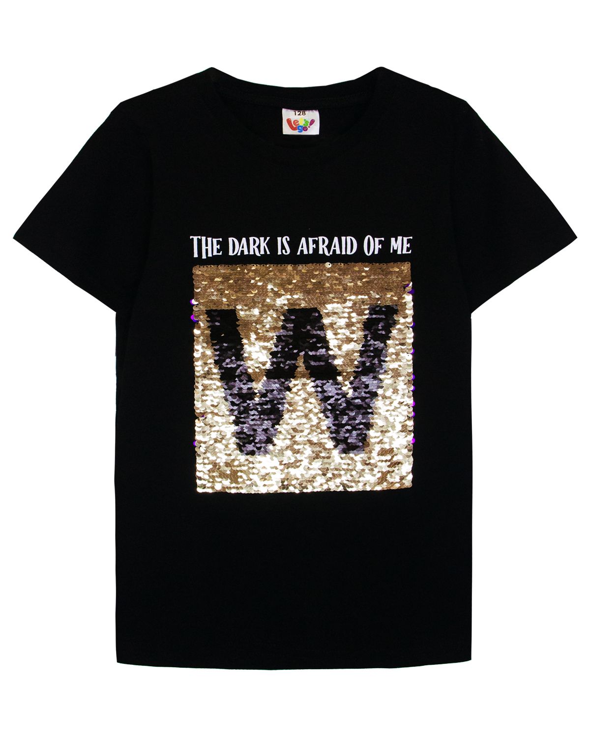 Футболка для девочки прямого силуэта с втачным коротким рукавом. Горловина круглая обработана воротником из рибаны. Горловина спинки внутри укреплена бейкой из кулирки. Низ изделия и рукавов обработан швом в подгибку. На полочке Шелкография + вышивка пайетками.