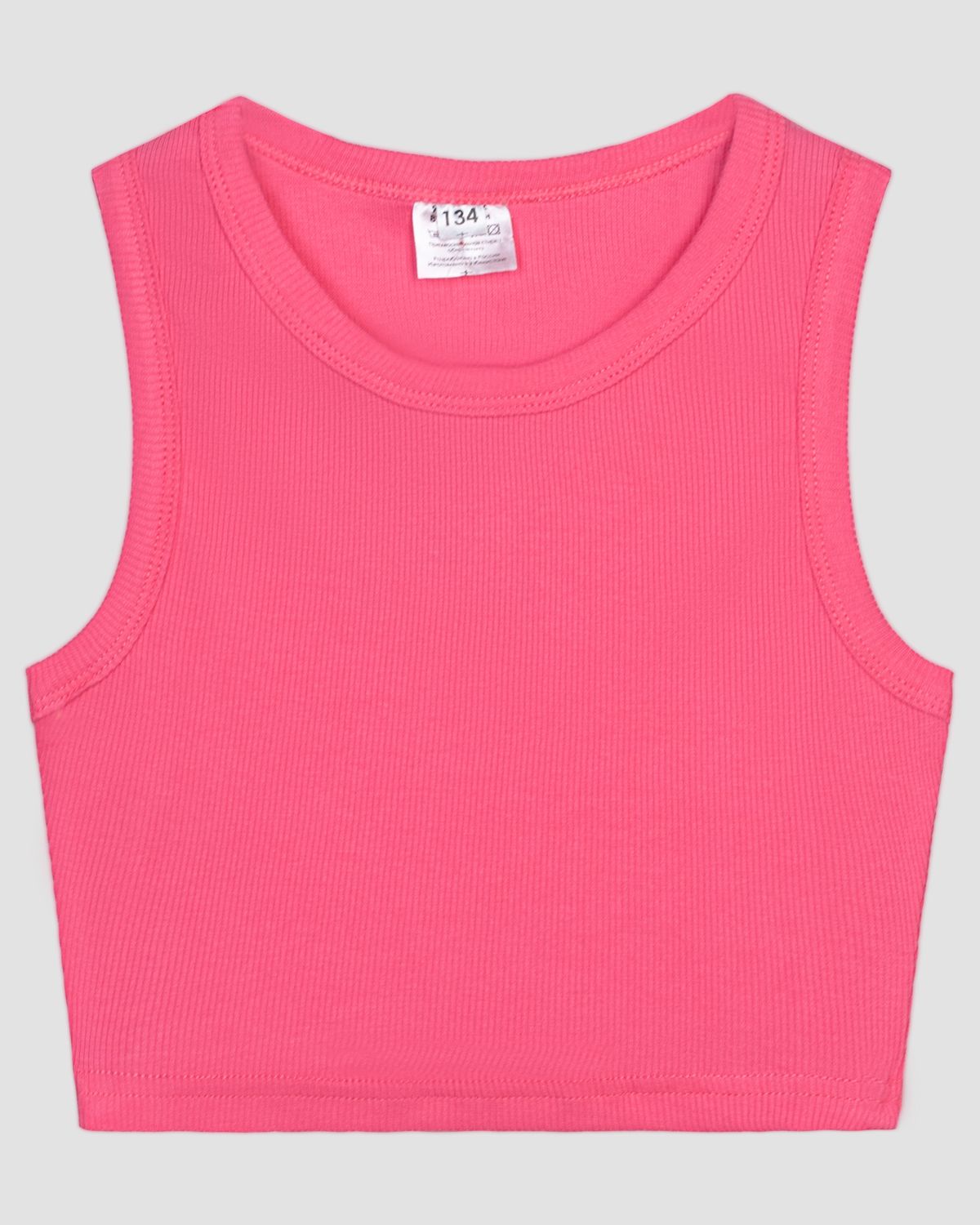 Топ для девочки приталенного силуэта из гладкокрашенного полотна. Линия горловины и проймы круглые, обработана бейкой из кашкорсе. Низ изделия обработан швом вподгибку.