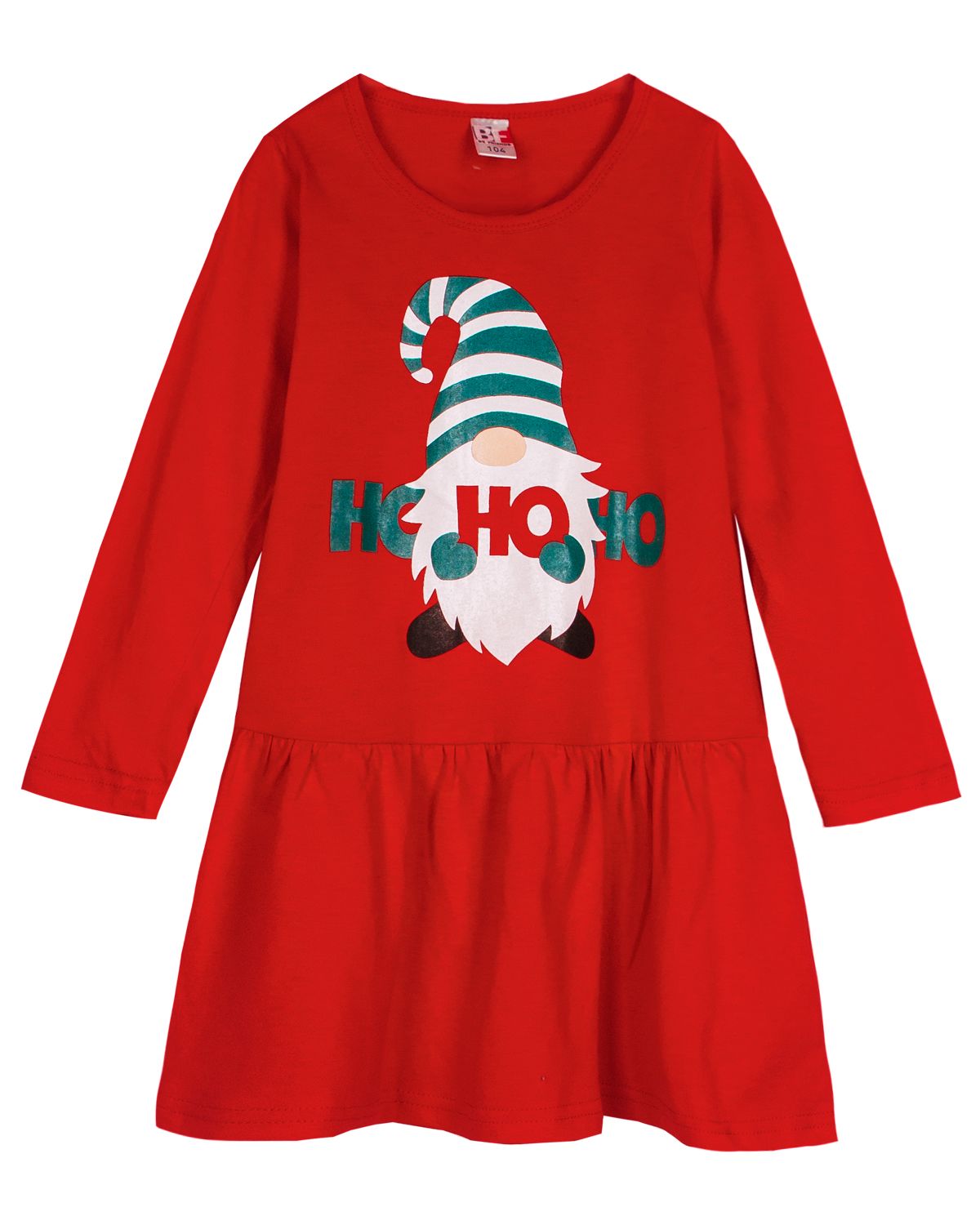 Платье А-силуэта для девочки из гладкокрашенной кулирки. На полочке принт (шелкография). Платье умеренного объема, с воланом со сборкой по низу. У платья длинный втачной рукав. Округлый вырез горловины обработан бейкой из основного полотна.