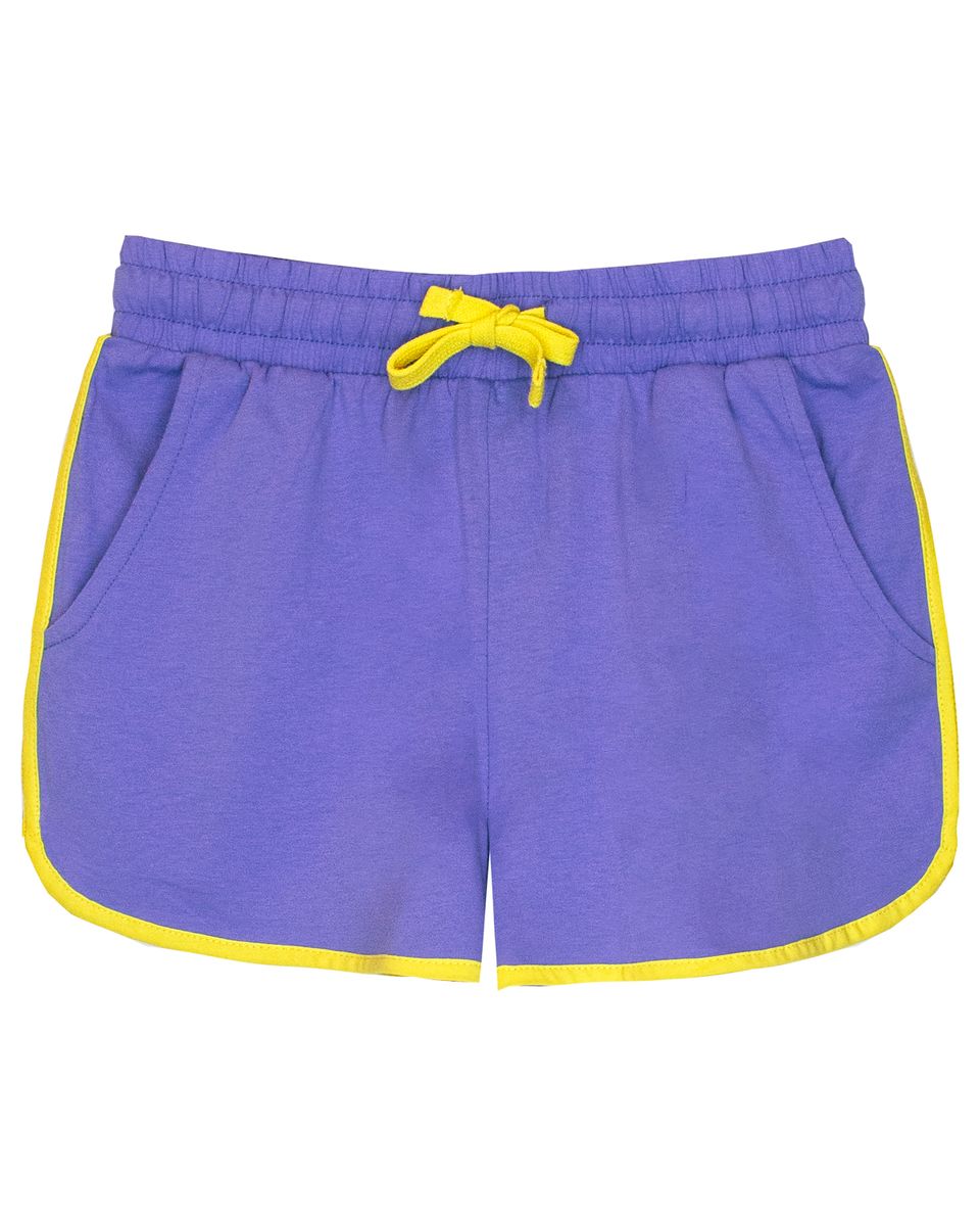 Шорты для девочки прямого силуэта из однотонного полотна. Пояс отрезной в цвет изделия, выполнен из основного полотна, с эластичной тесьмой внутри. По поясу шорт вставлен плоский утягивающий шнурок. На передних половинках шорт выполнены карманы с отрезным бочком. Боковой шов и низ изделия обработаны бейкой контрастного цвета.