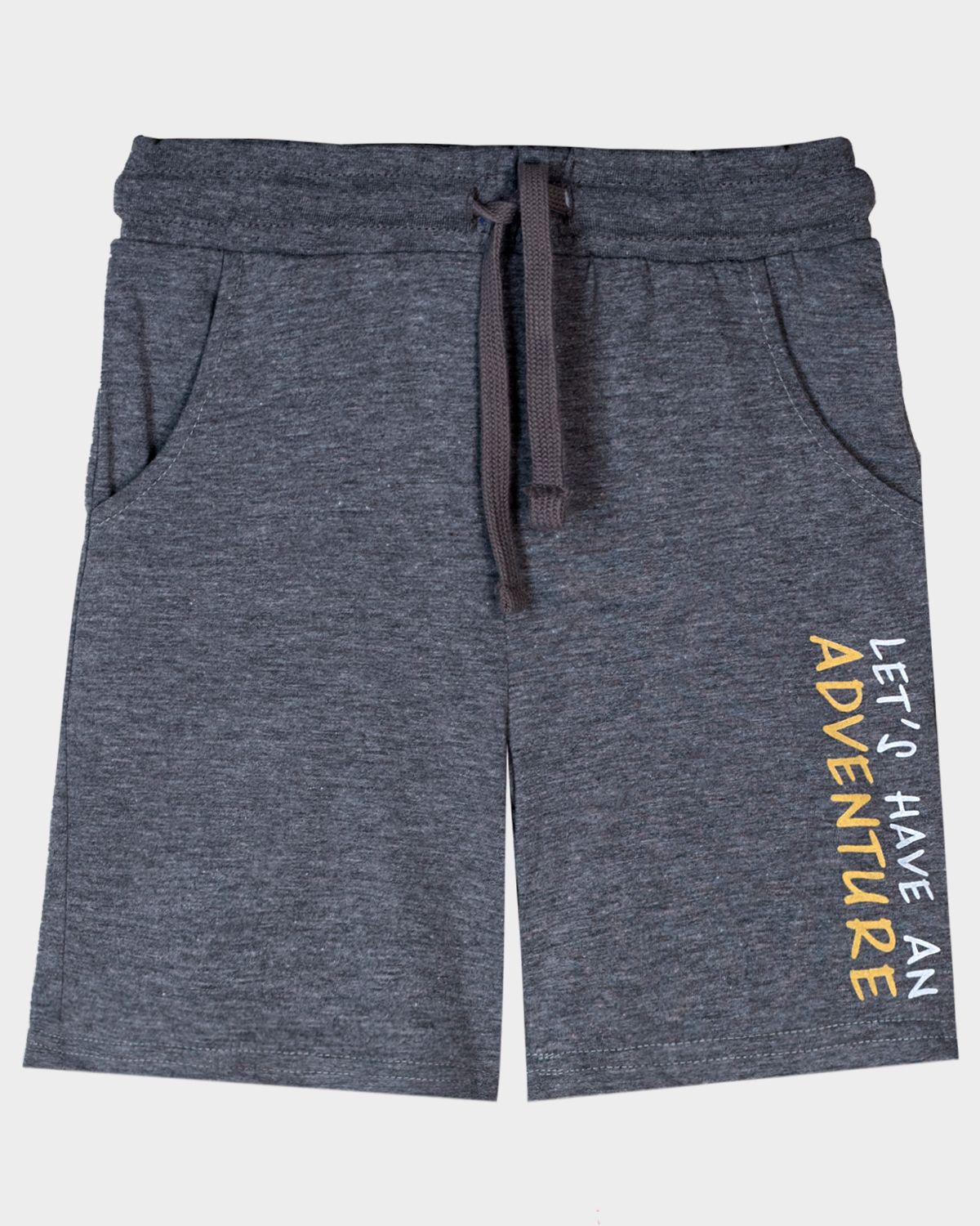 Шорты для мальчика прямого силуэта. Пояс отрезной выполнен из основного полотна, с эластичной тесьмой внутри. По поясу шорт вставлен плоский утягивающий шнурок. На передних половинках шорт выполнены карманы с отрезным бочком. Низ изделия обработан швом вподгибку. На передней половинке шорт принт Шелкография. Надпись переводится как "Давайте отправимся в приключение".