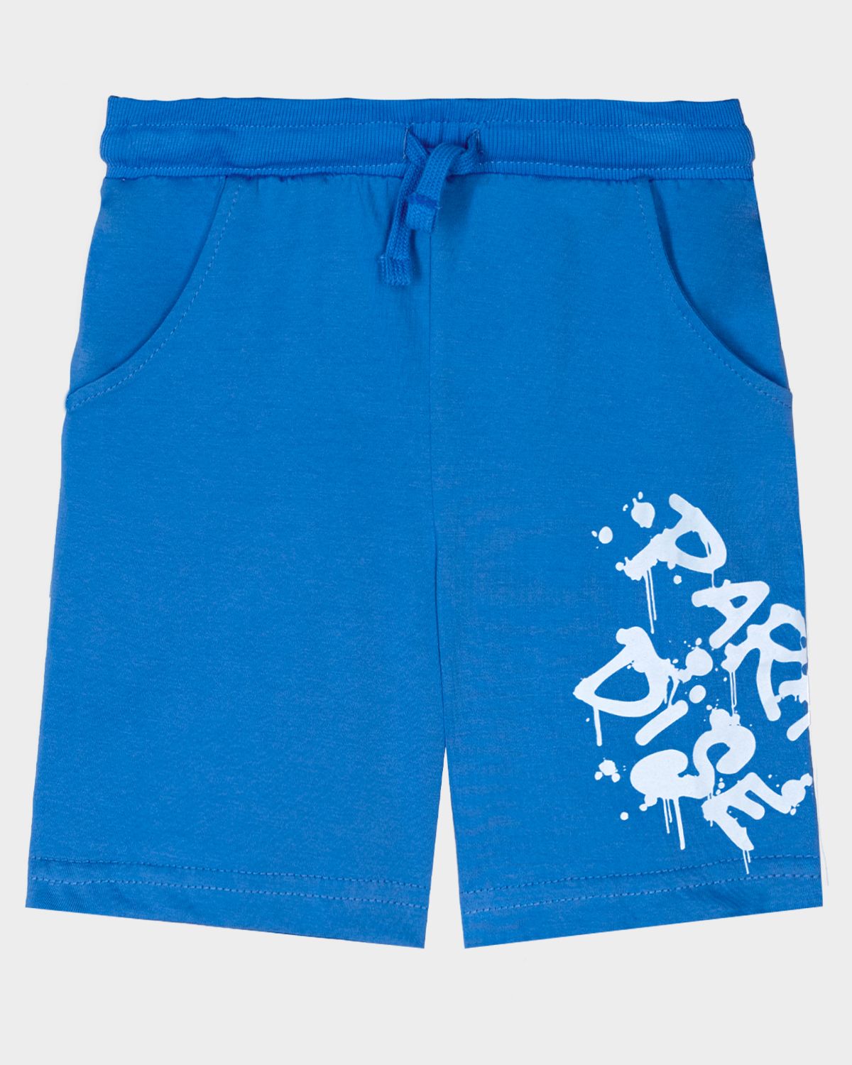 Шорты для мальчика прямого силуэта. Пояс отрезной выполнен из основного полотна, с эластичной тесьмой внутри. По поясу шорт вставлен плоский утягивающий шнурок. На передних половинках шорт выполнены карманы с отрезным бочком. Низ изделия обработан швом вподгибку. На передней половинке шорт принт Шелкография. Надпись переводится как "Рай".