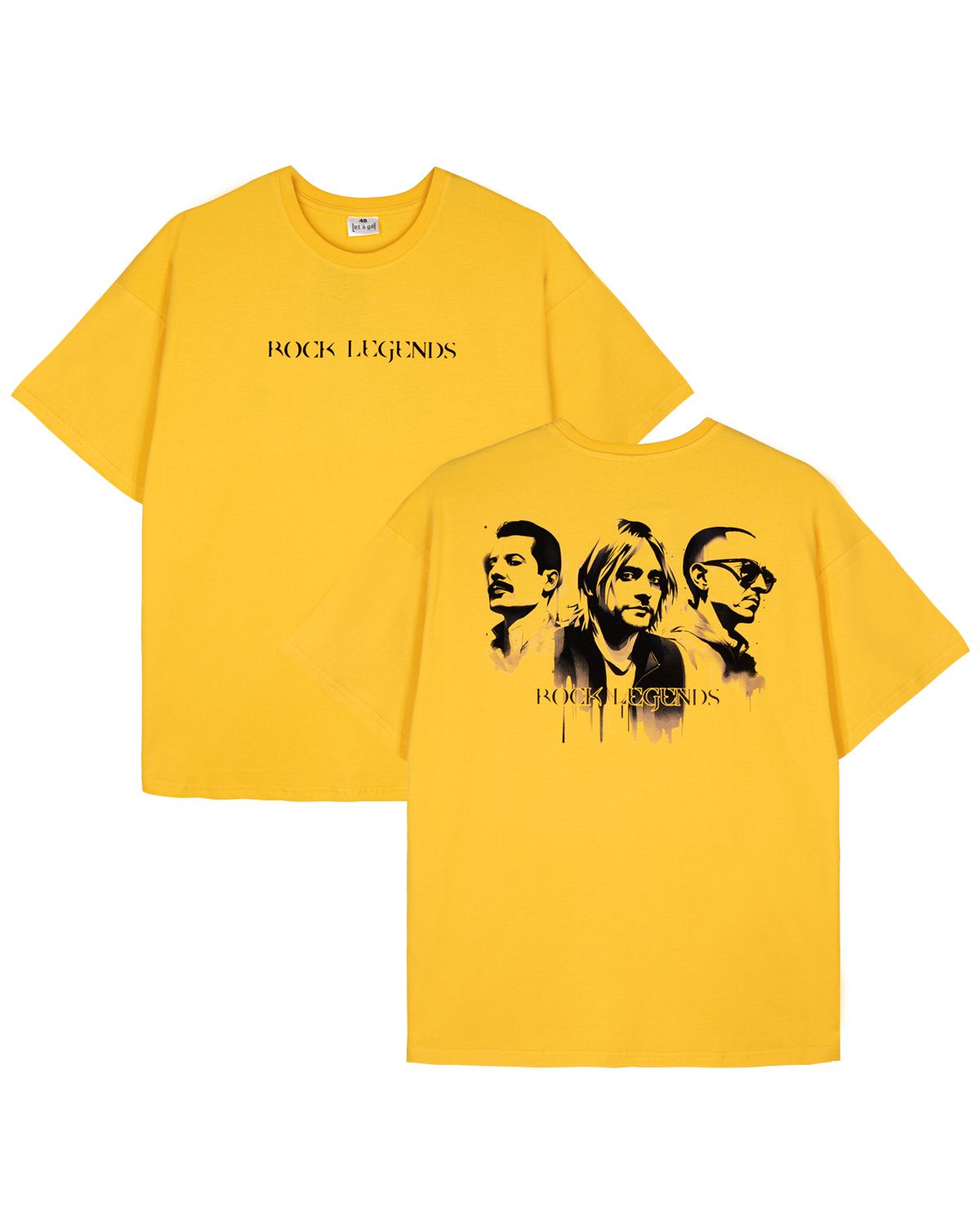 Футболка мужская оверсайз с втачным удлиненным рукавом. Горловина круглая, обработана воротником из рибаны. Горловина спинки внутри обработана настрочной планкой из кулирки. Низ изделия и рукавов обработан швом вподгибку. На полочке принт шелкография, на спинке фотопринт. Надпись переводится как "Легенды рока". Модель рассчитана на рост 176-182см.