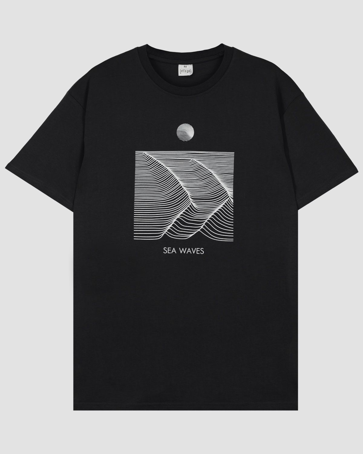 Футболка мужская (оверсайз) свободного силуэта, с коротким рукавом. Горловина круглая, обработана воротником из рибаны. Низ изделия и рукавов обработан швом в подгибку. На полочке принт ШЕЛКОГРАФИЯ. Надпись переводится как "Морские волны". Модель рассчитана на рост 176-182см.