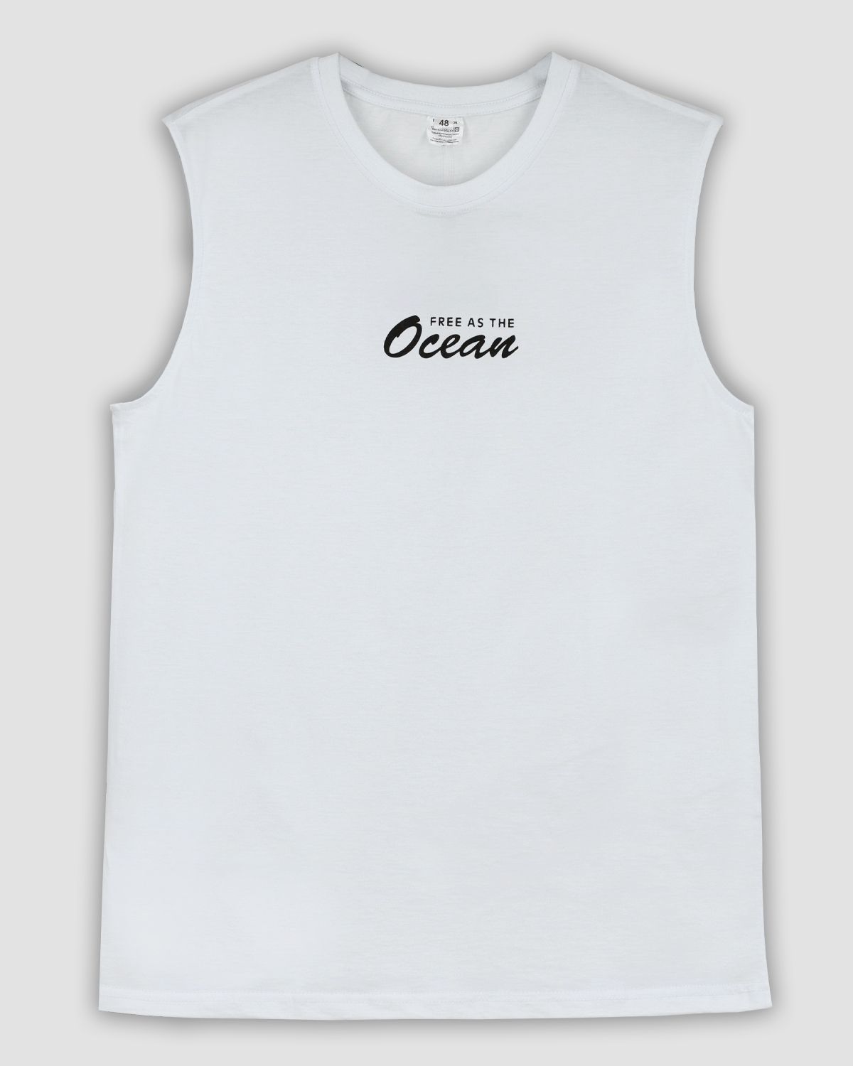 Майка мужская прямого силуэта. Горловина круглая, обработана воротником из рибаны. Горловина спинки внутри укреплена бейкой из кулирки. Низ изделия и рукавов обработан швом вподгибку. На полочке принт ШЕЛКОГРАФИЯ. Надпись переводится как "Свободен как океан". Модель рассчитана на рост 176-182.