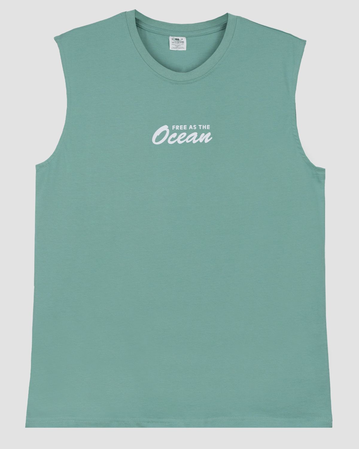Майка мужская прямого силуэта. Горловина круглая, обработана воротником из рибаны. Горловина спинки внутри укреплена бейкой из кулирки. Низ изделия и рукавов обработан швом вподгибку. На полочке принт ШЕЛКОГРАФИЯ. Надпись переводится как "Свободен как океан". Модель рассчитана на рост 176-182.