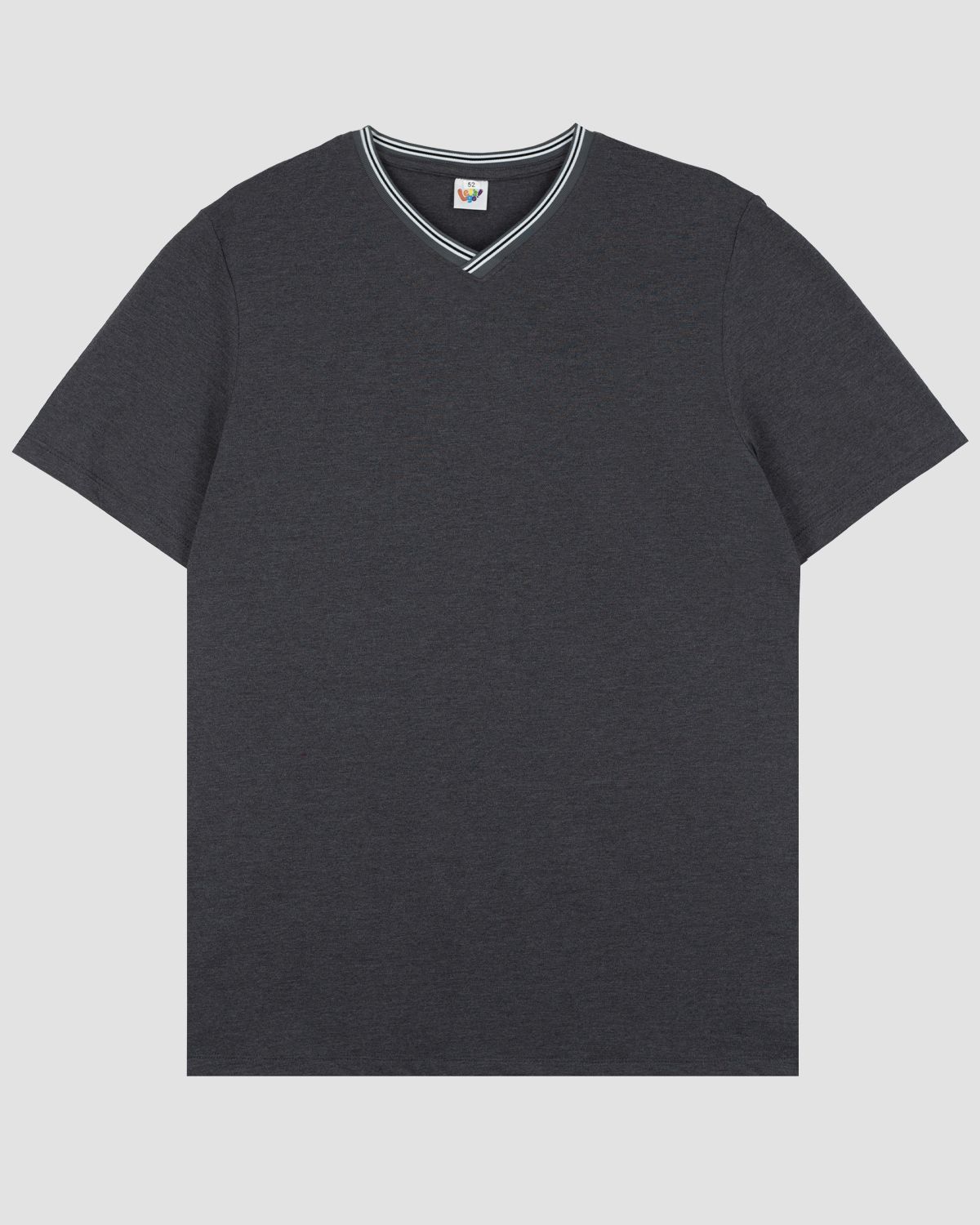 Футболка взрослая прямого силуэта с втачным коротким рукавом. Горловина V-образная форма, обработана воротником из подвяза, в цвет изделия. По горловине полочки и спинки отделочная строчка в цвет изделия. Низ изделия и рукавов обработан швом в подгибку. Модель рассчитана на рост 176-182см.
