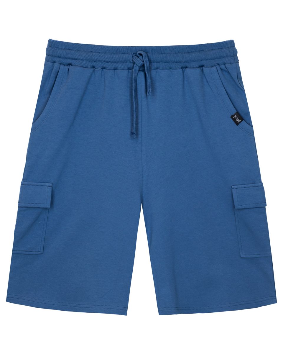 Шорты мужские, прямого силуэта с накладными карманами. Отрезной пояс, в цвет изделия, из кашкорсе с эластичной тесьмой внутри, закрепленной в шов. По поясу шорт вставлен плоский утягивающий шнурок. Длина шнурка = длина пояса + 45 см для возможности завязывания. На передней половинке шорт карманы с отрезным бочком. На боковом срезе шорт располагается накладной карман с клапаном из основного полотна. Карман располагается с 2-х сторон симметрично. Низ изделия обработан швом в подгибку. На левом кармане вшивной элемент, закрепленный отстрочкой. Модель рассчитана на рост 176-182см.