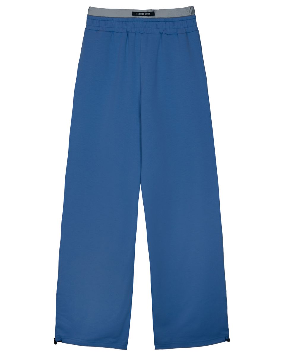 Брюки женские прямого силуэта. Пояс отрезной, выполнен из основного полотна, с эластичной тесьмой внутри. К верхнему срезу поясу притачена резинка, но выглядывает из пояса. На резинке декоративная нашивка. Надпись переводится как "Модный стиль". Модель рассчитана на рост 164-170см.