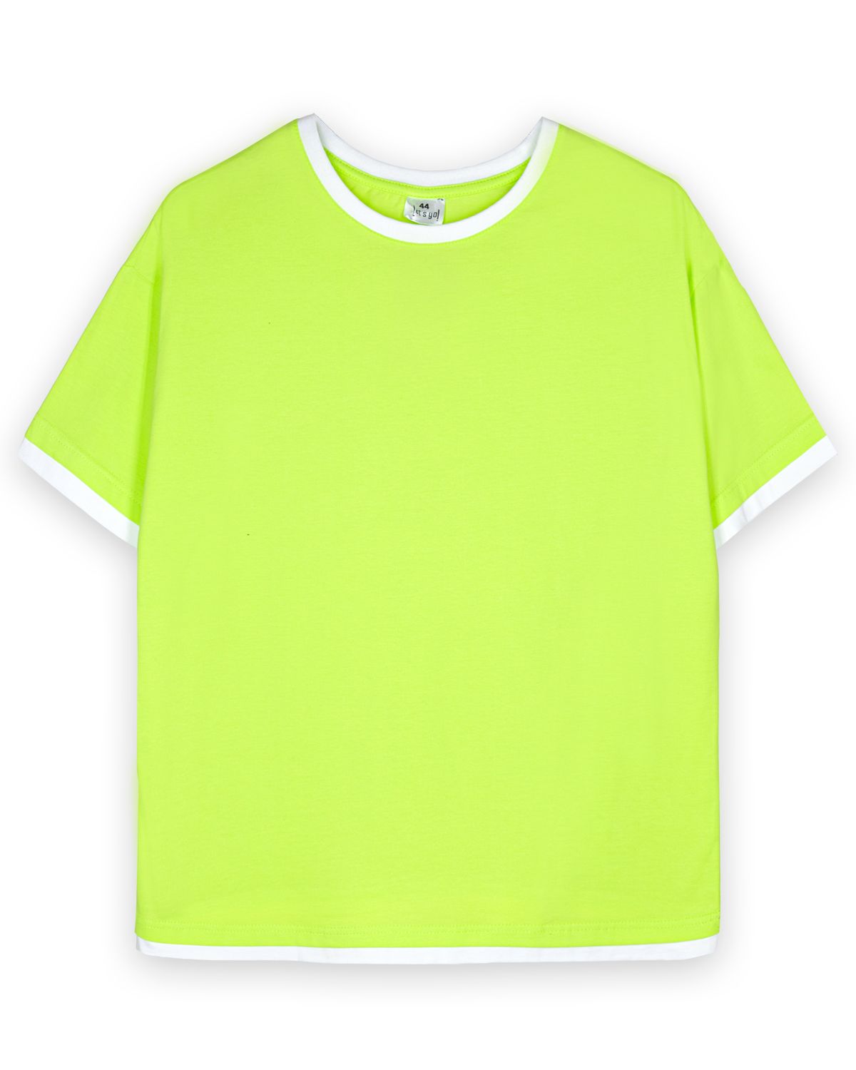 Футболка женская (оверсайз) свободного силуэта, с коротким рукавом. Горловина круглая, обработана воротником из рибаны молочного цвета. Горловина спинки внутри обработана бейкой из кулирки. По горловине полочки отделочная строчка. Низ изделия и рукавов обработан манжетом из кулирки молочного цвета. Модель рассчитана на рост 164-170см.