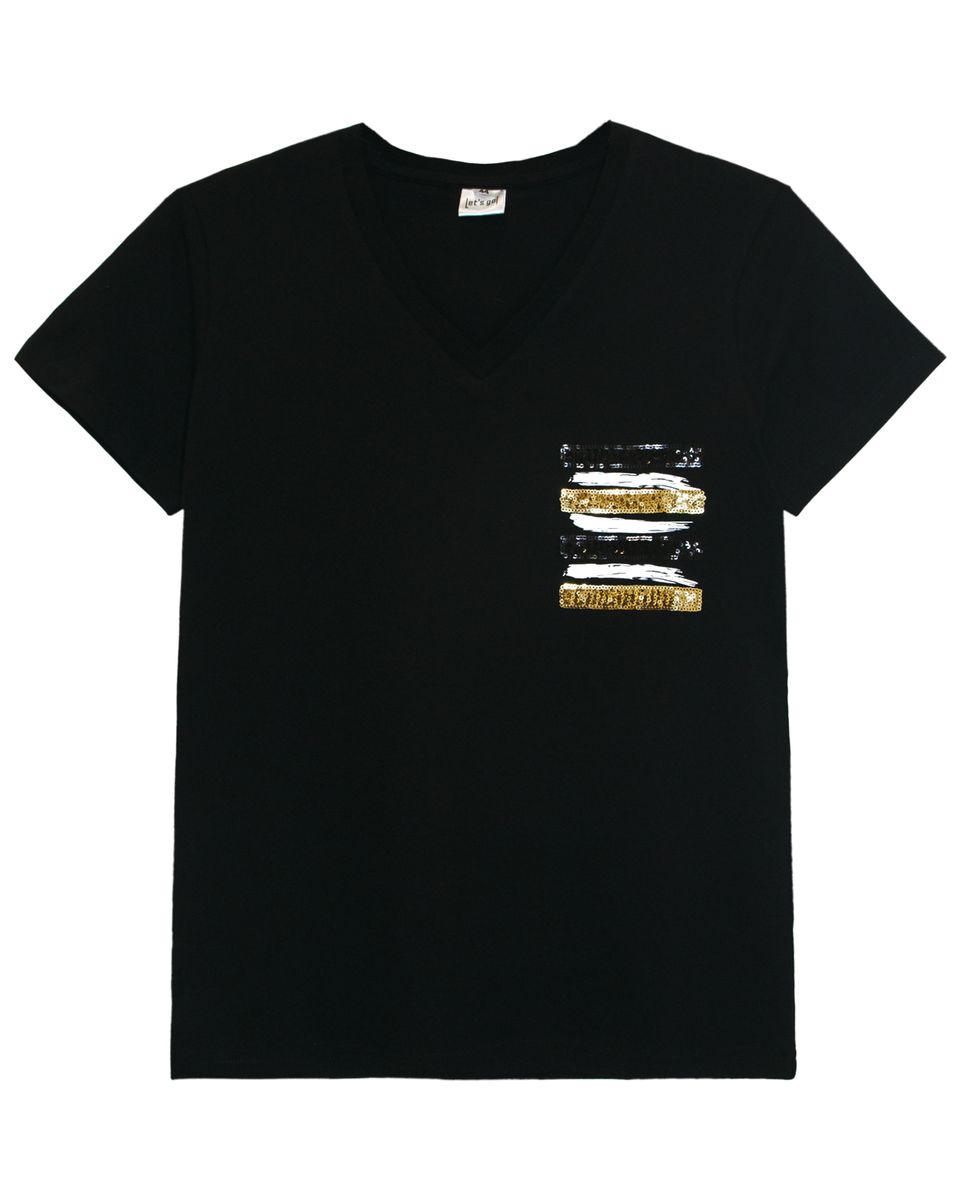 Футболка женская прямого силуэта с втачным коротким рукавом. Горловина V-образная, обработана воротником из кулирки, в цвет изделия. Горловина спинки внутри обработана настрочной планкой из кулирки. Низ изделия и рукавов обработан швом вподгибку. На полочке принт шелкография + вышивка паетками. Модель рассчитана на рост 164-170см.