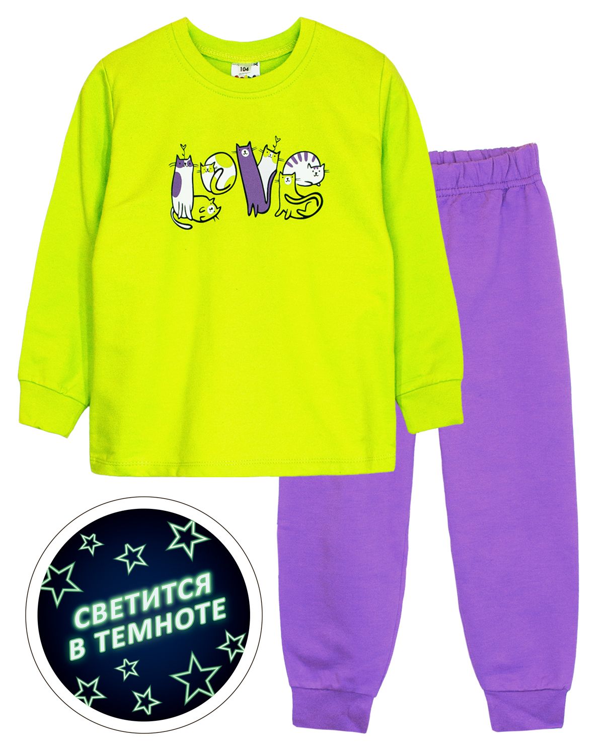 Пижама для девочки, состоящая из джемпера и брюк. Джемпер прямого силуэта, с втачным длинным рукавом. Горловина круглая обработана воротником из рибаны. По низу рукавов манжеты из рибаны. Низ изделия обработан швом в подгибку. На полочке принт шелкография с флуоресцентной краской. Брюки прямого покроя, из однотонного полотна. Пояс цельнокроенный, с эластичной тесьмой внутри. По низу изделия манжеты из рибаны. ПРИНТ СВЕТИТСЯ В ТЕМНОТЕ.