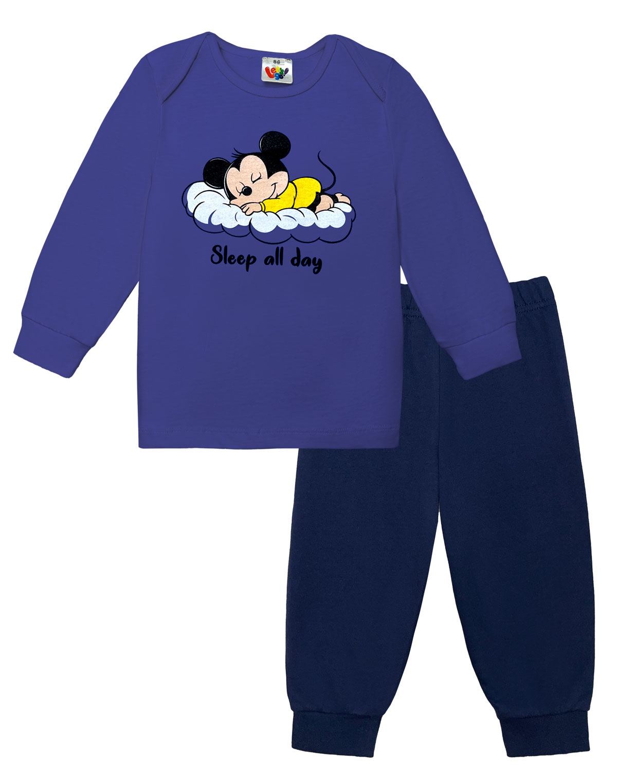 Пижама детская, состоящая из джемпера и брюк. Джемпер прямого силуэта, с втачным длинным рукавом. Горловина круглая, обработана бейкой из рибаны. Спинка, в плечевых швах, переходит на полочку с нахлестом 5см, образуя фигурное закругление к точке основания шеи, по край обработан бейкой из рибаны. По низу рукавов манжеты из рибаны. Низ изделия обработан швом вподгибку. На полочке принт Шелкография. Надпись переводится как "Спать весь день". Брюки прямого силуэта, из однотонного полотна. Пояс цельнокроенный, с эластичной тесьмой внутри. По низу изделия манжеты из рибаны.