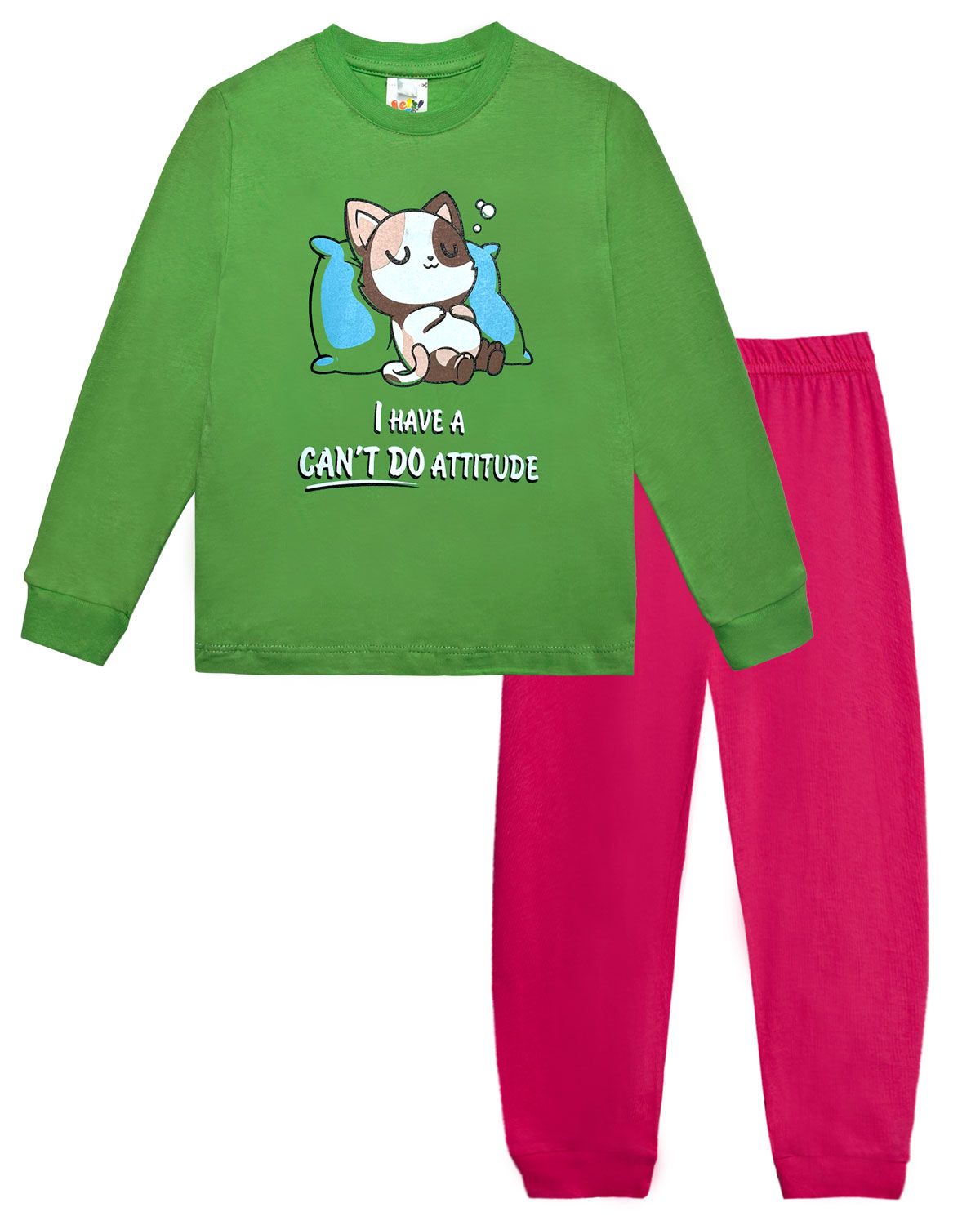 Пижама для девочки, состоящая из джемпера и брюк. Джемпер прямого силуэта, с втачным длинным рукавом. Горловина круглая обработана обтачкой из рибаны. По низу рукавов манжеты из рибаны. Низ изделия обработан швом вподгибку. На полочке принт Шелкография. Надпись переводится как "У меня нерешительный настрой". Брюки прямого силуэта, из однотонного полотна. Пояс цельнокроенный, с эластичной тесьмой внутри. По низу изделия манжеты из рибаны.
