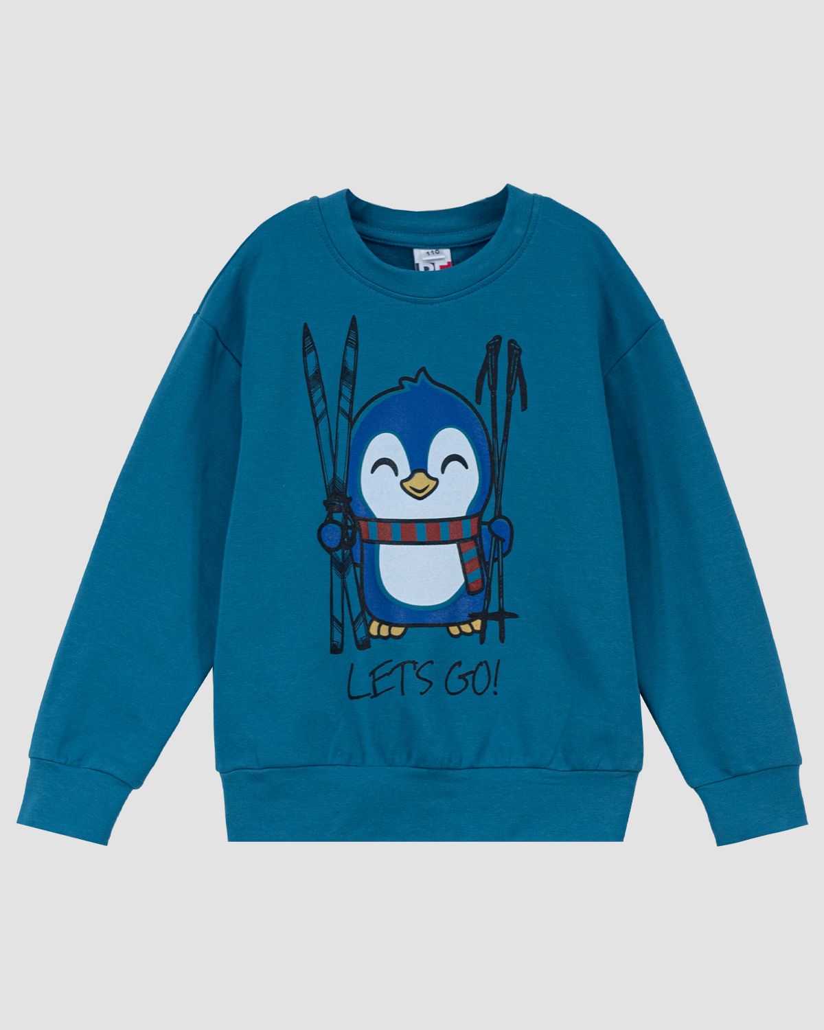 Свитшот детский прямого силуэта. Длинный рукав со спущенной линией плеча. Горловина круглая, обработана воротником из рибаны. Горловина спинки внутри обработана бейкой из кулирки. Рукав заканчивается манжетой из рибаны. По низу изделия притачивается манжет из кашкорсе. На полочке принт ШЕЛКОГРАФИЯ.