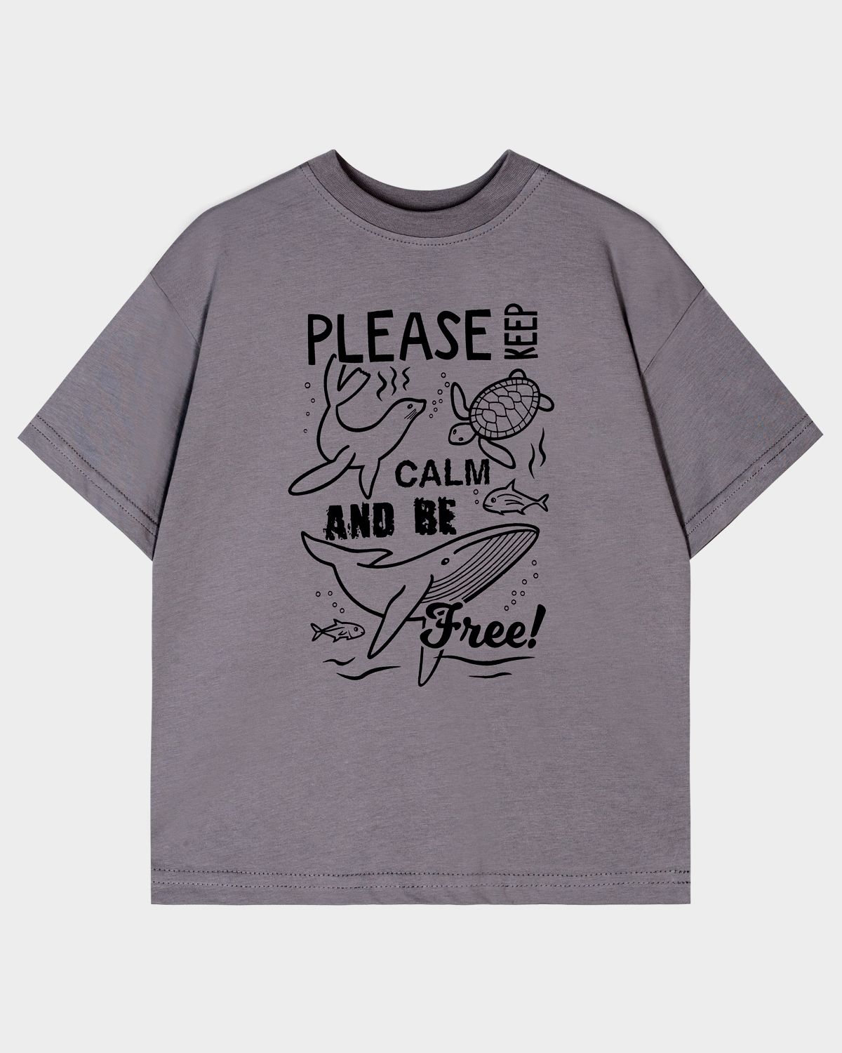 Футболка для мальчика свободного силуэта (оверсайз) с коротким рукавом. Горловина круглая, обработана обтачкой горловиной из рибаны. Низ изделия и рукава обработаны швом вподгибку. На полочке принт Шелкография. Надпись переводится как "Пожалуйста, сохраняйте спокойствие и будьте свободны!".