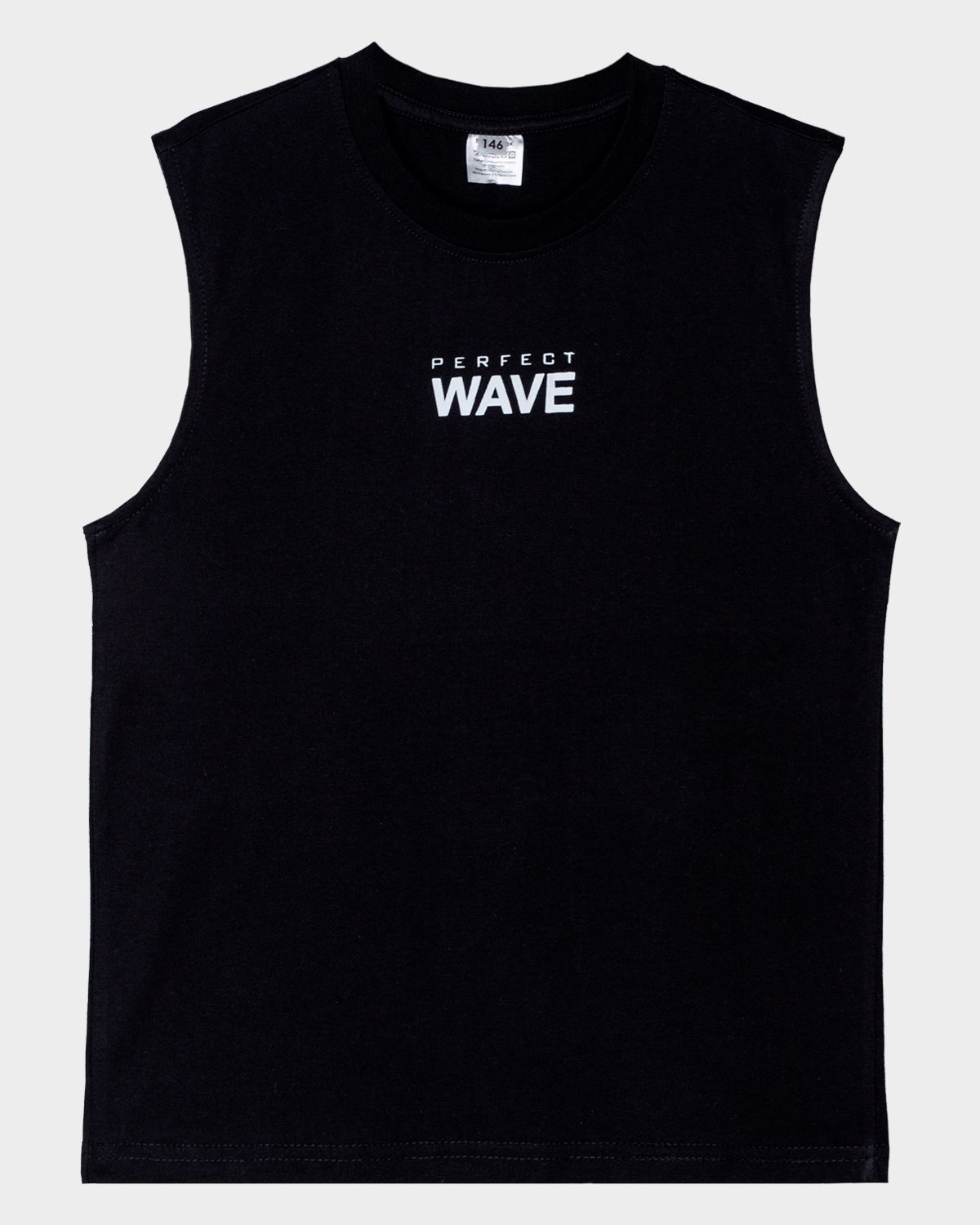 Майка для мальчика прямого силуэта. Горловина круглая, обработана обтачкой из рибаны. По горловине полочки отделочная строчка. Пройма обрабатывается окантовкой из основного полотна, затем выворачивается на изнанку и настрачивается. Низ изделия обработан швом вподгибку, шириной 2 см, нитками в цвет изделия. На полочке принт Шелкография. Надпись переводится как "Потрясающая волна".