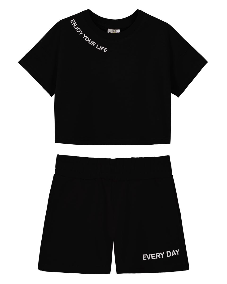Комплект для девочки состоящий из футболки укороченной и шорт. Футболка для девочки прямого силуэта укороченная, со спущенным плечом коротким рукавом. Горловина круглая, обработана воротником из кашкорсе. Горловина спинки внутри укреплена бейкой из кулирки. На полочке принт Шелкография. Шорты для девочки трапецевидного силуэта. Пояс отрезной выполнен из основного полотна в цвет изделия, с эластичной тесьмой внутри. В боковых швах выполнены карманы с листочкой. Низ изделия обработан швом в подгибку. На левой передней половинке шорт принт Шелкография. Надпись переводится как "Наслаждайся своей жизнью; Каждый день".