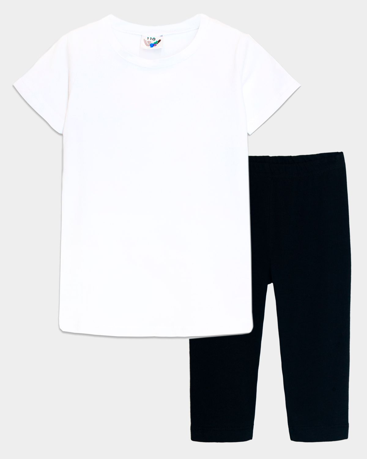 Комплект для девочки, состоящий из футболки и бридж. Бриджи прилегающего силуэта, со средним швом. Пояс цельнокроеный с эластичной тесьмой, закреплённой в шов. Изготовлены кулирной глади качества пенье. Футболка из кулирки. Горловина обработана кулиркой. Росток спинки обработан бейкой из кулирки. Рукав втачной, короткий.
