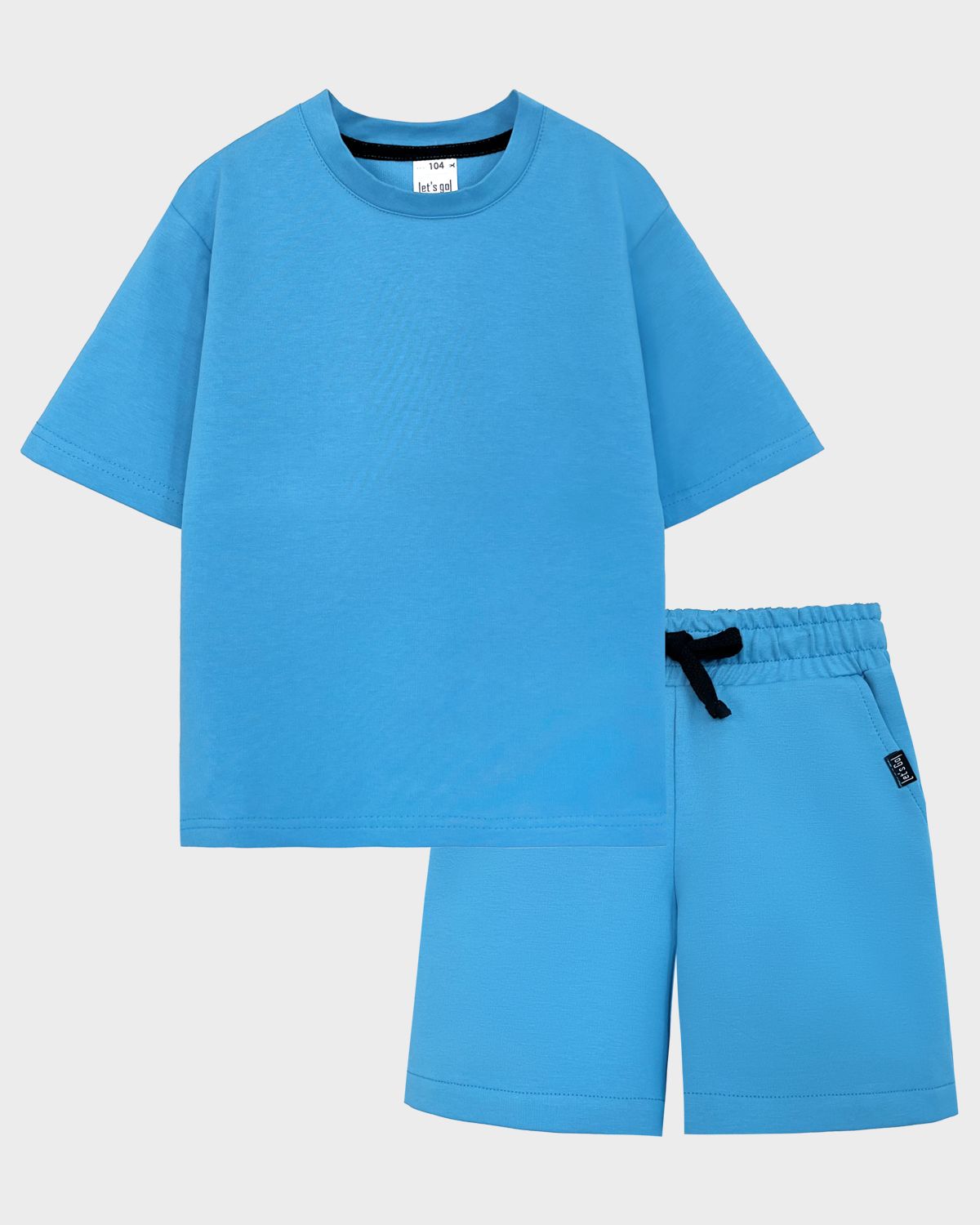 Комплект детский, состоящий из футболки и шорт. Футболка свободного силуэта (оверсайз) с коротким рукавом.Горловина круглая, обработана воротником из основного полотна. Низ изделия и рукава обработан швом вподгибку. Шорты прямого силуэта. Пояс отрезной в цвет изделия с эластичной тесьмой внутри. По поясу шорт вставлен плоский утягивающий шнурок, в цвет шорт.На передней половинке шорт карманы с отрезным бочком, вход карман обработан строчкой. На левом кармане вшивной элемент, закрепленный отстрочкой. Низ изделия обработан швом вподгибку.