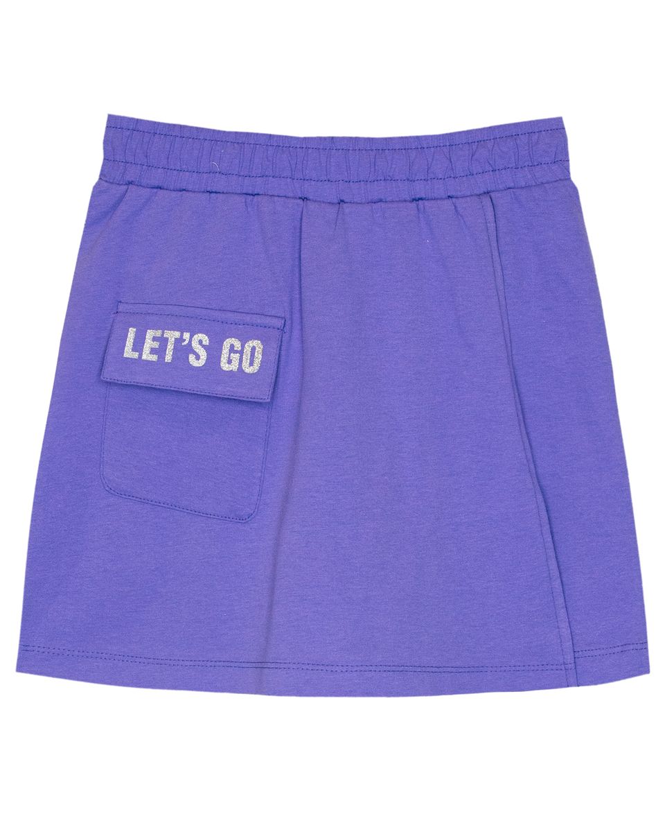 Шорты для девочки прямого силуэта из кулирки с накладным карманом. Пояс отрезной в цвет изделия, выполнен из основного полотна, с эластичной тесьмой внутри. В передней части изделия расположена отлётная часть – имитация запаха, из основного полотна. На отлетной части запаха выполнен накладной карман с клапаном из основного материала. На клапане принт шелкография с глиттером. Низ изделия и отлетная часть запаха обработан швом в подгибку. Надпись переводится как "Вперед".