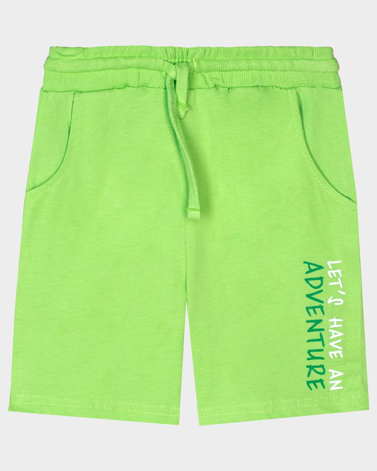 Шорты для мальчика прямого силуэта. Пояс отрезной выполнен из основного полотна, с эластичной тесьмой внутри. По поясу шорт вставлен плоский утягивающий шнурок. На передних половинках шорт выполнены карманы с отрезным бочком. Низ изделия обработан швом вподгибку. На передней половинке шорт принт Шелкография. Надпись переводится как "Давайте отправимся в приключение".