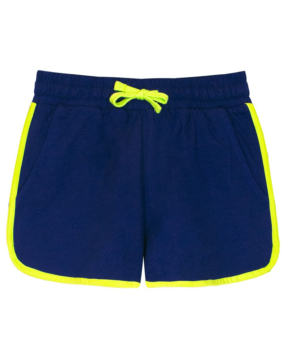 Шорты для девочки прямого силуэта из однотонного полотна. Пояс отрезной в цвет изделия, выполнен из основного полотна, с эластичной тесьмой внутри. По поясу шорт вставлен плоский утягивающий шнурок. На передних половинках шорт выполнены карманы с отрезным бочком. Боковой шов и низ изделия обработаны бейкой контрастного цвета.