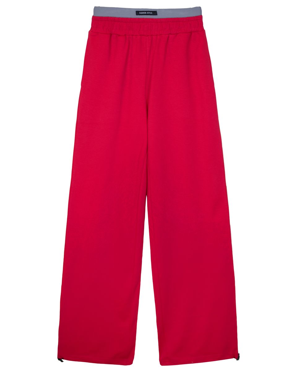 Брюки женские прямого силуэта. Пояс отрезной, выполнен из основного полотна, с эластичной тесьмой внутри. К верхнему срезу поясу притачена резинка, но выглядывает из пояса. На резинке декоративная нашивка. Надпись переводится как "Модный стиль". Модель рассчитана на рост 164-170см.