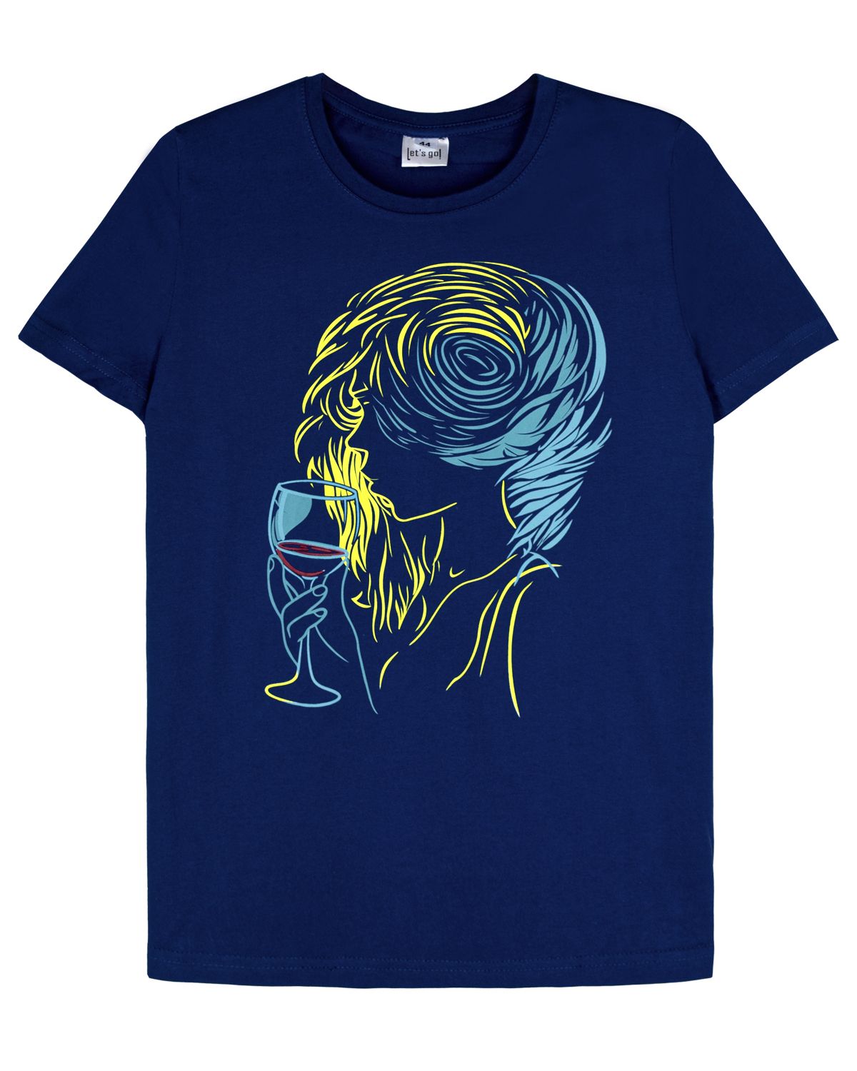 Футболка женская прямого силуэта с втачным коротким рукавом. Горловина круглая, обработана воротником из рибаны. Горловина спинки внутри обработана бейкой из кулирки. По горловине полочки отделочная строчка. Низ изделия и рукавов обработан швом вподгибку. На полочке принт шелкография. Модель рассчитана на рост 164-170см.